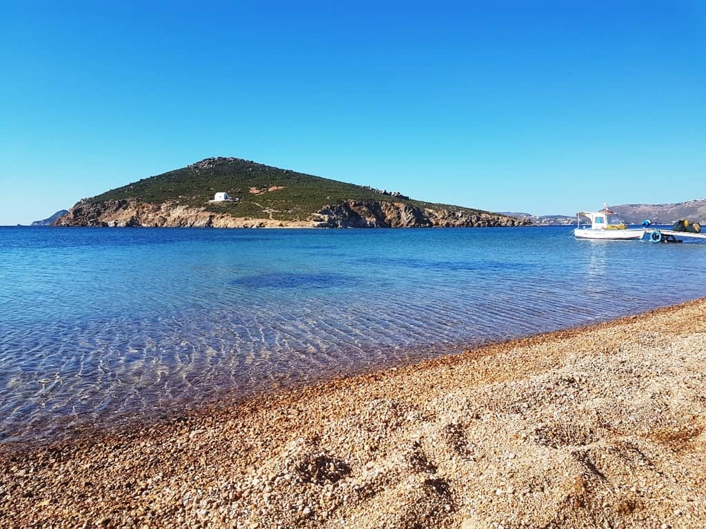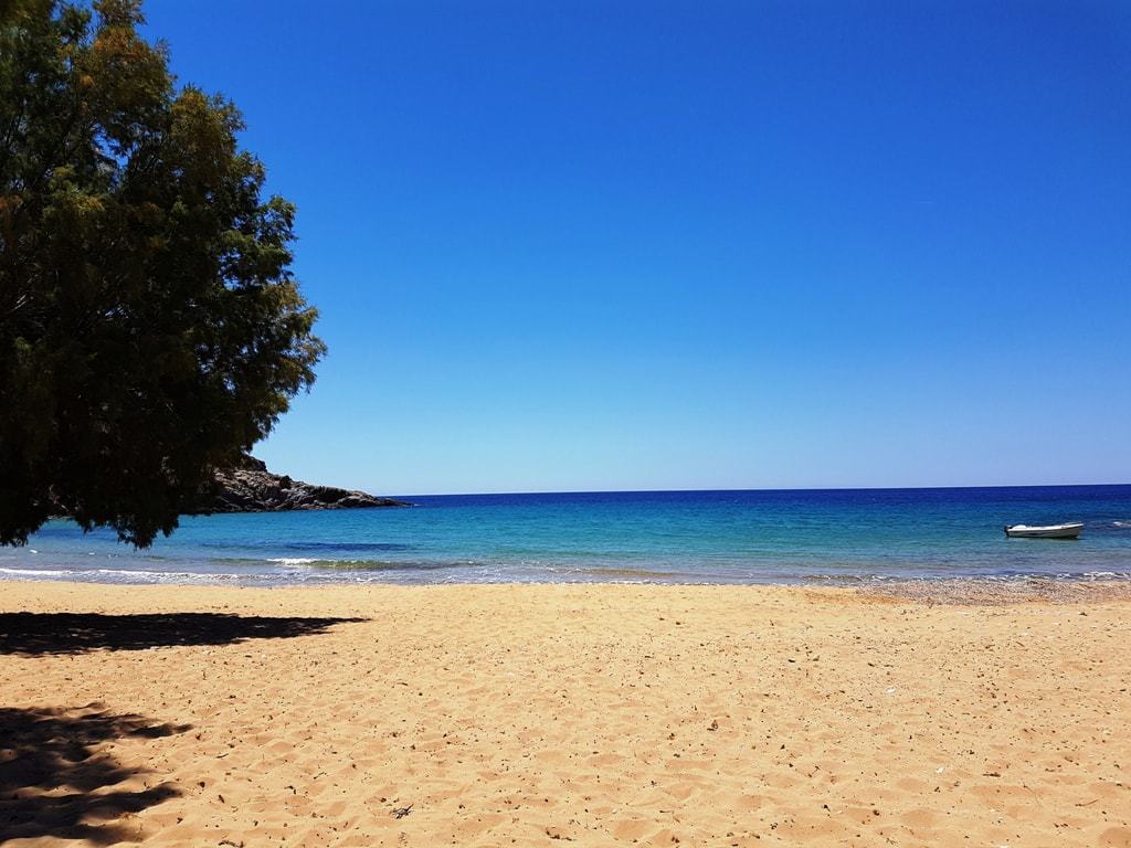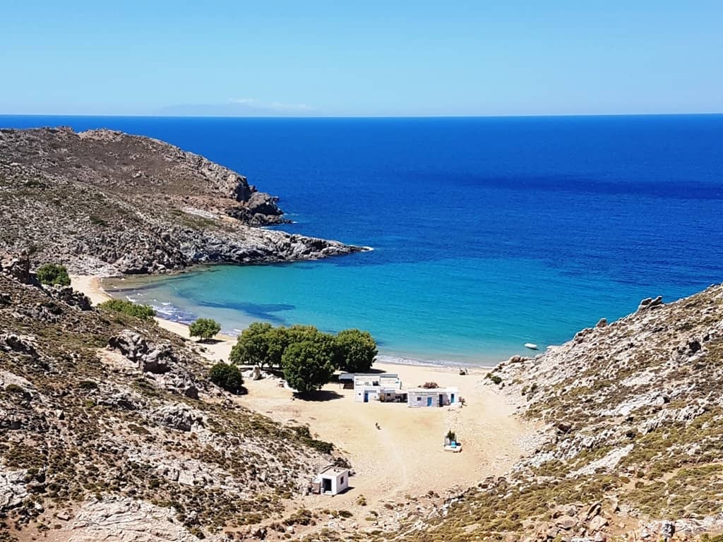 These twin crescent beaches lie next to each other and are pebbled with crystal-clear blue waters. Tamarisk trees provide shade, but otherwise, there are no facilities there. It is reachable by boat or by car and is becoming increasingly popular as roads improve from Kambos via Vagia.