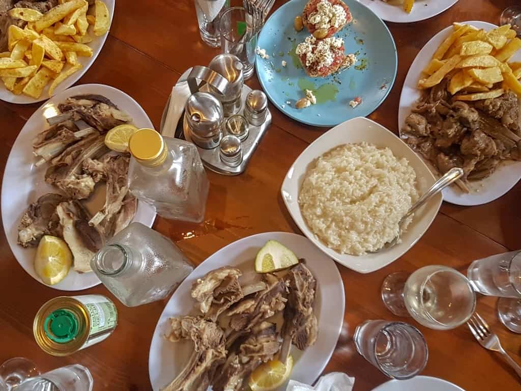 After we left the hut, we drove back toward the coast along the ridge, enjoying gorgeous panoramic views the whole way. We stopped for lunch at a small tavern in Therissos, where the owners plied us with Cretan wines and traditional food like lamb, sausages, and more. The tour ended back in Chania after we drove through the Therissos Gorge following our leisurely lunch.